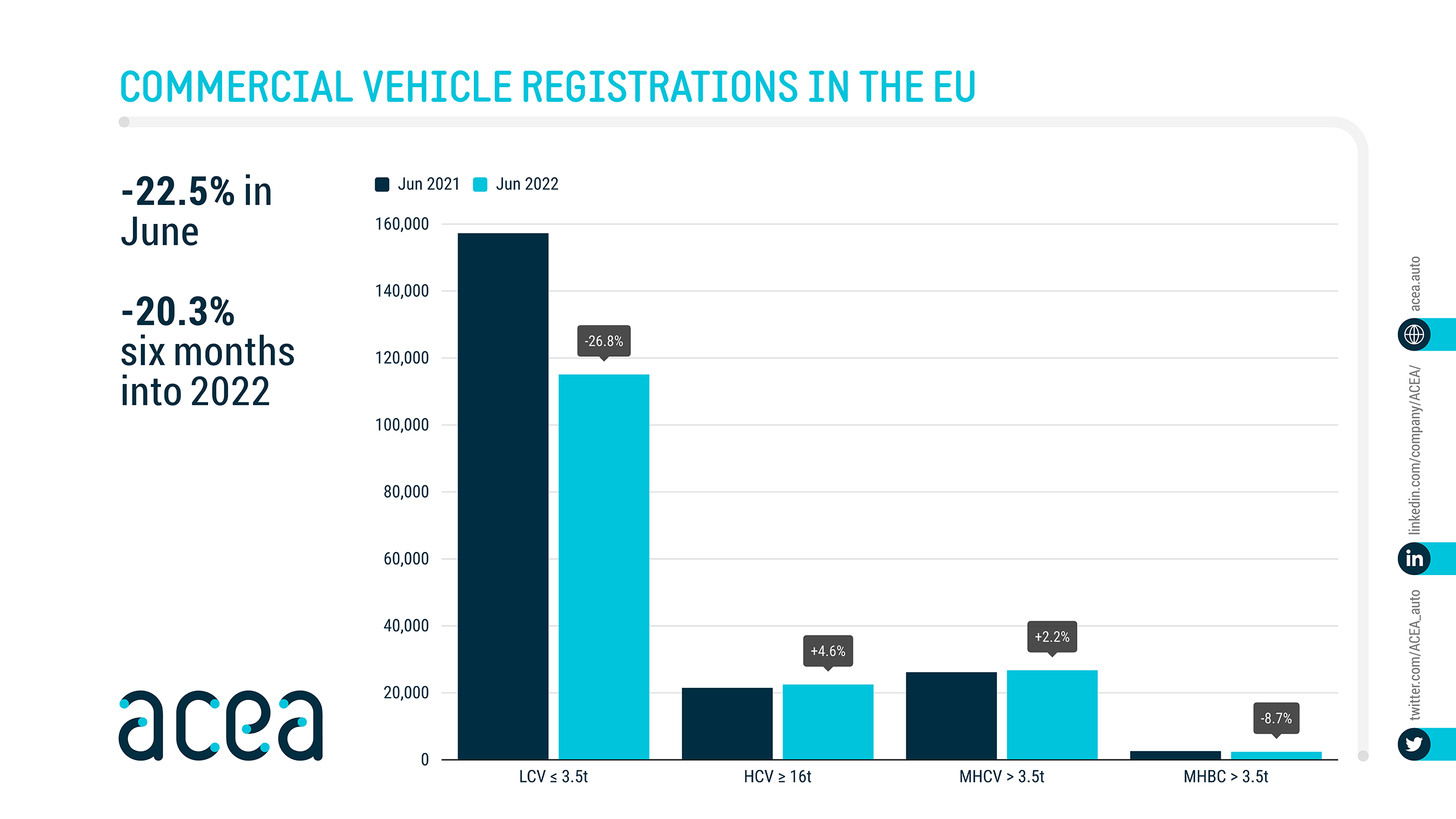 Commercial vehicle registrations: -20.3% first half of 2022; -22.5% in June