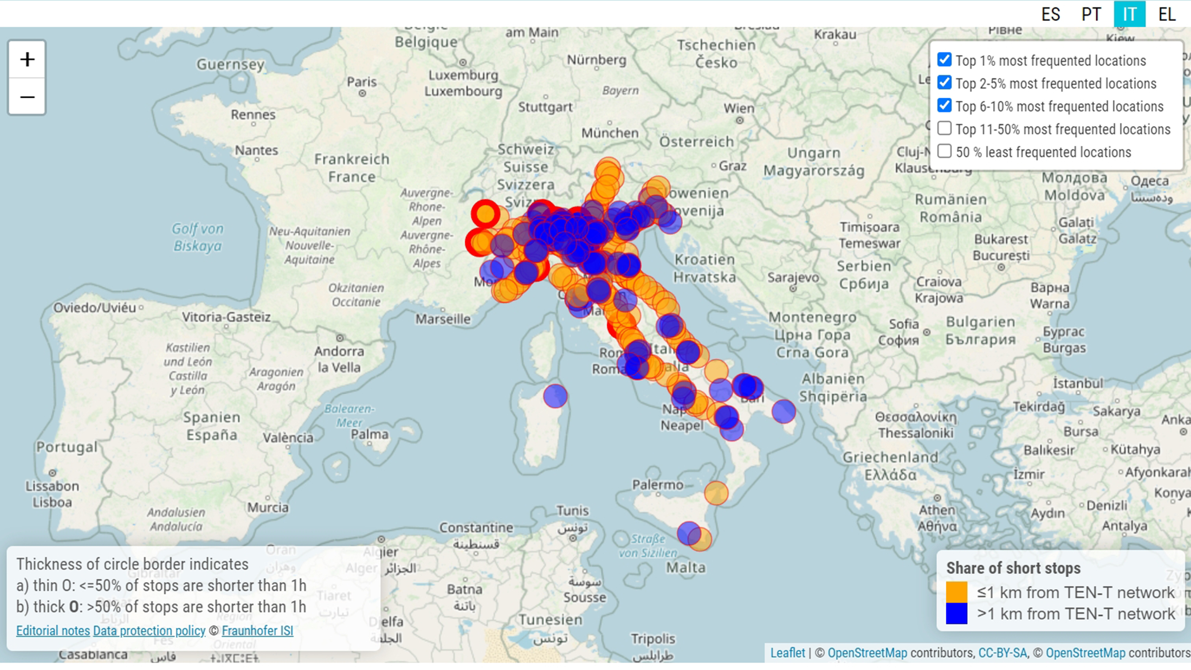 Interactive maps – Electric trucks: stop locations, southern Europe