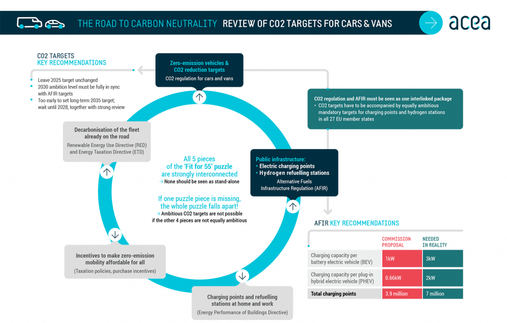 All puzzle pieces of the ‘Fit for 55’ EU climate package are strongly interconnected. This means that the EU Regulation setting CO2 reduction targets for passenger cars and vans must be seen together with the Alternative Fuels Infrastructure Directive (AFIR) as one interlinked package.